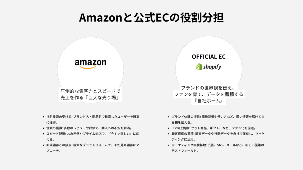 この整理により、「Amazonがあるから公式ECは不要」ではなく、「Amazonを活かすためにこそ、公式ECを『マーケティング拠点』に変える」という方針が固まりました。