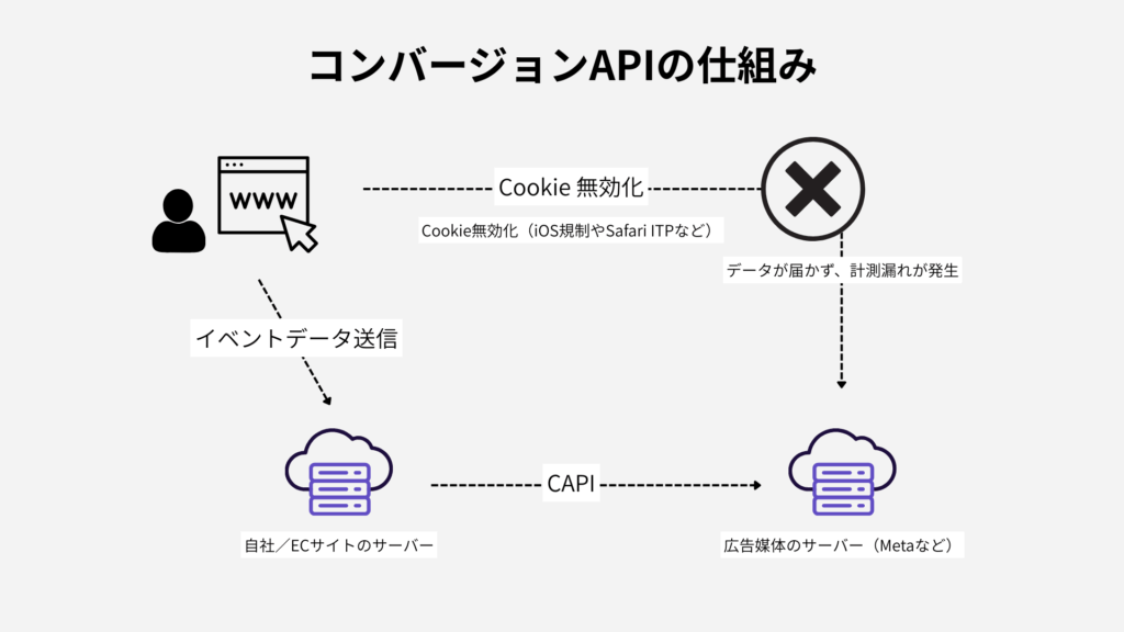 ブラウザ(Cookie)だけに頼らず、サーバー側から直接イベントデータを送信。これにより、SafariやiOSユーザーのコンバージョン計測漏れを防ぎ、広告媒体に「正しい成果」をフィードバックできる状態にしました。